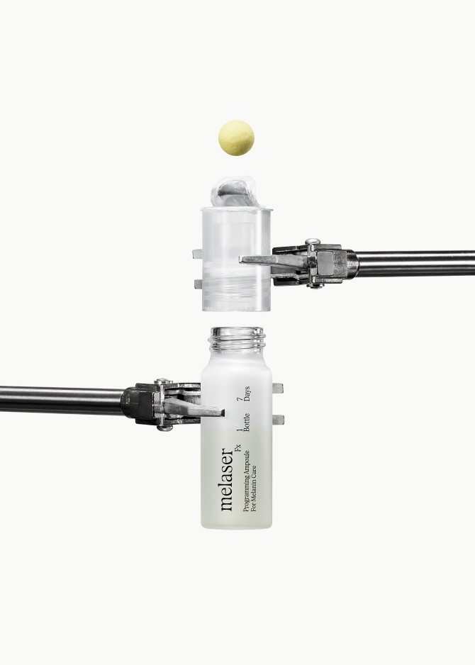 더 나아가, 비건 뷰티의 새로운 경지이자 효과 우선주의 뷰티를 보여줄 첫 번째 제품은 '멜레이저(melaser) 7일 프로그래밍 앰플' 일명 '바르는 토닝 레이저'다. 비타 토닝과 MTS(Microneedle Therapy System)의 원리를 담아 7일 만에 피부의 멜라닌과 기미, 잡티 등을 집중적으로 개선해 미백 효과를 제공한다.
