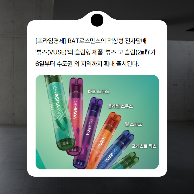 [프라임경제] BAT로스만스의 액상형 전자담배 '뷰즈(VUSE)'의 슬림형 제품 '뷰즈 고 슬림(2㎖)'가 6일부터 수도권 외 지역까지 확대 출시된다.