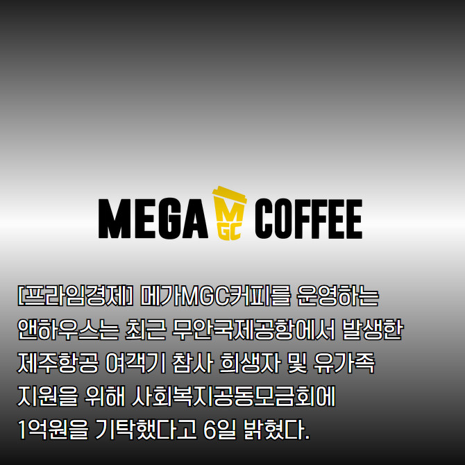 대한민국 대표 커피브랜드 메가MGC커피를 운영하는 앤하우스는 최근 무안국제공항에서 발생한 제주항공 여객기 참사 희생자 및 유가족 지원을 위해 사회복지공동모금회에 1억원을 기탁했다고 6일 밝혔다.