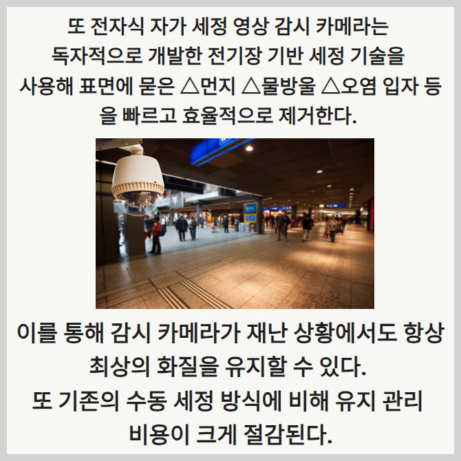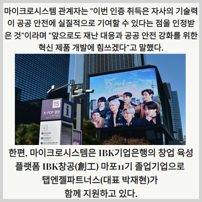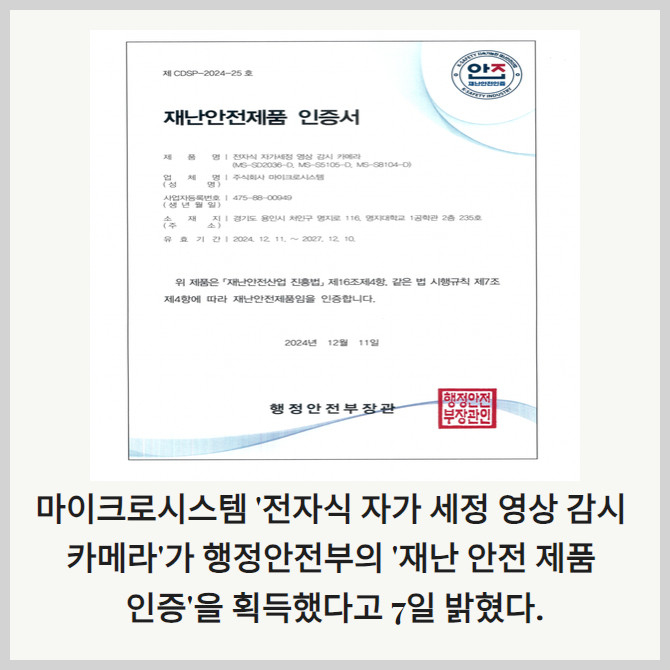 [프라임경제] 마이크로시스템의 '전자식 자가 세정 영상 감시 카메라'가 행정안전부의 '재난 안전 제품 인증'을 획득했다고 7일 밝혔다.