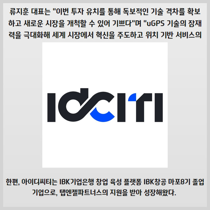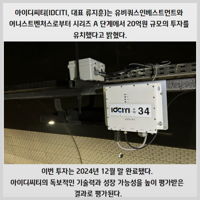[프라임경제] 아이디씨티(IDCITI, 대표 류지훈)는 유비쿼스인베스트먼트와 어니스트벤처스로부터 시리즈 A 단계에서 20억원 규모의 투자를 유치했다고 밝혔다.