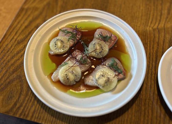 이어 '방어회 크루도'가 나왔다. 회와 키위라고 하면 어색한 조합이라고 생각했다. 그러나 완전히 예상을 벗어났다. 크루도(Crudo)란, 이탈리아식 회 요리로 날 것의 식재료를 향신료·소스와 함께 먹는 것을 뜻한다. 임 셰프는 기존의 크루도 메뉴에 제철 과일을 활용해 왔다고 전했다. 그는 "썬골드키위를 요리에 자주 활용해 왔고, 흑백요리사 촬영 때도 사용했었다"고 밝혔다. 방어회와 함께 먹은 키위는 정말 잘 어울렸다. 방어 특유의 기름진 맛을 상큼한 키위가 잘 중화해 줬다. 키위는 부드럽게 씹혀 과일이라고는 생각도 못 했고, 속의 씨앗은 세모가시리와 꼬독꼬독한 식감을 줬다.