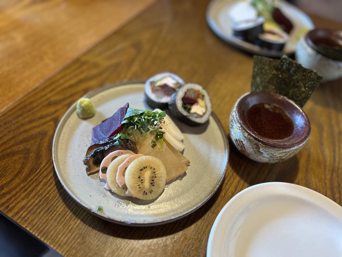 가장 먼저 나온 '베지테리안 사시미'는 부토의 대표 메뉴이자 '흑백요리사'에도 나왔던 메뉴이다. 순수 채소로만 만들어졌지만 마치 진짜 사시미를 먹고 있는 듯한 착각이 들게끔 하는 것이 포인트다. 제스프리의 썬골드키위는 연근과 함께 나란히 올려졌다. 임 셰프는 연근 특유의 흙 맛과 키위의 상큼함이 잘 어우러진다고 설명했다. 에피타이저로 입맛을 확 돋우는 데에 키위는 좋은 역할을 했다. 그다음 비트와 아보카도를 함께 김에 싸 먹어보니 참치회가 생각나는 식감과 맛이었다.