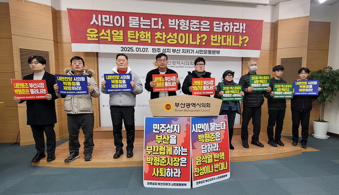 이어 이들은 "헌법을 위반한 불법계엄으로 내란죄를 저지른 윤석열 탄핵에 대해 박형준 시장은 찬성인지 반대인지 분명하게 입장 밝히지 못한다면 사퇴하라"라며 "윤 대통령의 체포에 대한 박형준 시장의 입장은 무엇인지 밝히라"고 재차 물었다.