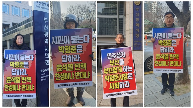 이들은 "오세훈 서울시장은 '비상계엄령은 잘못된 것' 이라며 탄핵의 부당함을 인정하고 자신의 입장을 분명하게 밝힌데 비해, 부산은 시의원들의 계엄지지에 이어 담화문 낭독까지 내란에 동조하는 행동을 보였음에도 박 시장은 그 어떤 언급이 없다" 면서 "독재정권과 맞서 싸운 부마항쟁의 도시이자 민주화의 성지인 부산의 박형준 시장은 사퇴하라"고 주장했다.