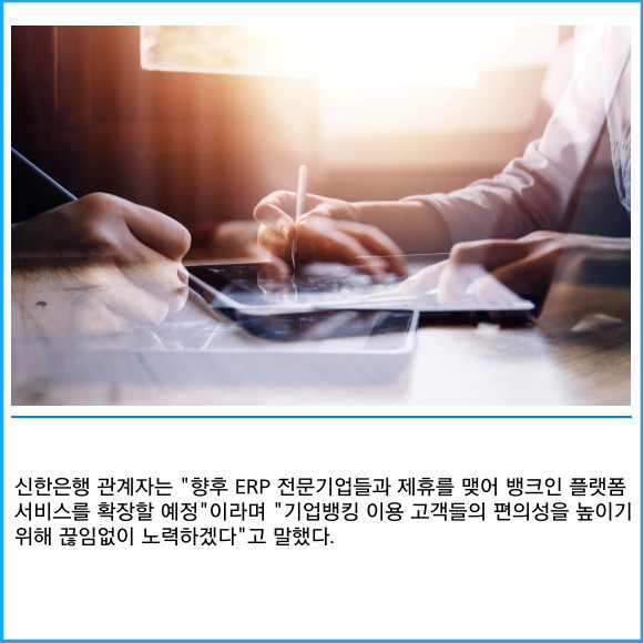 [프라임경제] 신한은행이 기업 전사적자원관리(ERP) 시스템과 연계한 '뱅크인 플랫폼' 서비스를 출시했다고 7일 밝혔다.