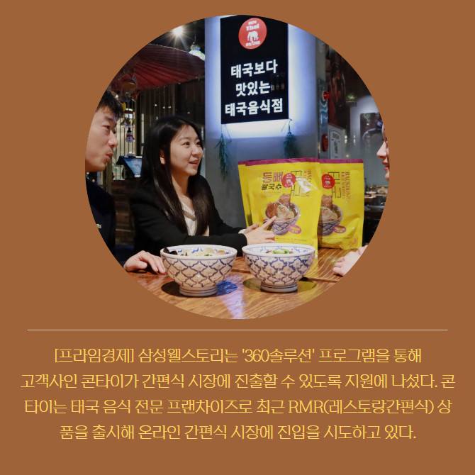 [프라임경제] 삼성웰스토리는 '360솔루션' 프로그램을 통해 고객사인 콘타이가 간편식 시장에 진출할 수 있도록 지원에 나섰다. 콘타이는 태국 음식 전문 프랜차이즈로 최근 RMR(레스토랑간편식) 상품을 출시해 온라인 간편식 시장에 진입을 시도하고 있다.