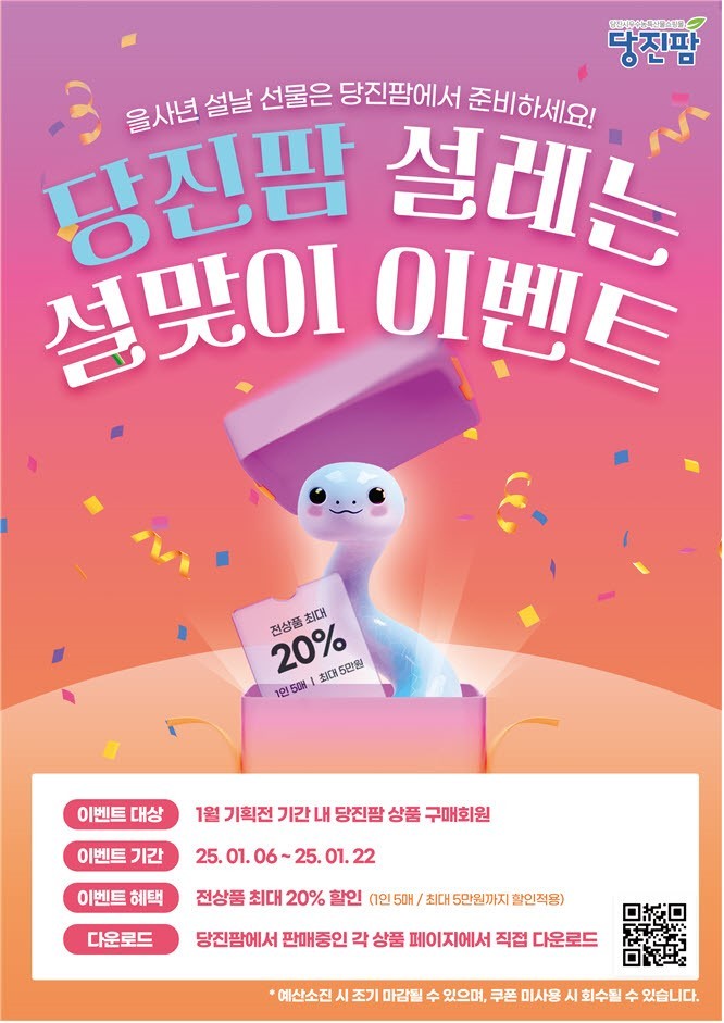 [프라임경제] 충남 당진시는 2024년 설 명절을 맞아 당진팜 쇼핑몰에서 1월6일부터 22일까지 특판 행사를 진행한다고 밝혔다.