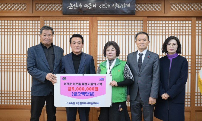 이날 기탁식에는 백성현 논산시장, 이응재 가야곡면 이장단협의회 회장, 백해순 가야곡면 새마을부녀회 회장, 윤여한 은진면 이장단협의회 회장, 박강희 논산시사회복지협의회 회장 등 관계자들이 참석했다.
