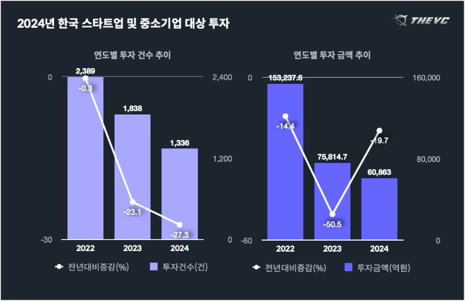 8일 더브이씨에 따르면 지난해 한국 국적 스타트업·중소기업 대상 투자 금액은 전년 대비 약 20% 감소한 6조 863억원이다. 전년 대비 투자금이 50% 이상 급감했던 2023년보다 양호한 수치다. 투자 건수의 경우 전년 대비 약 27% 감소한 1336건으로 2023년과 감소 폭이 유사했다.