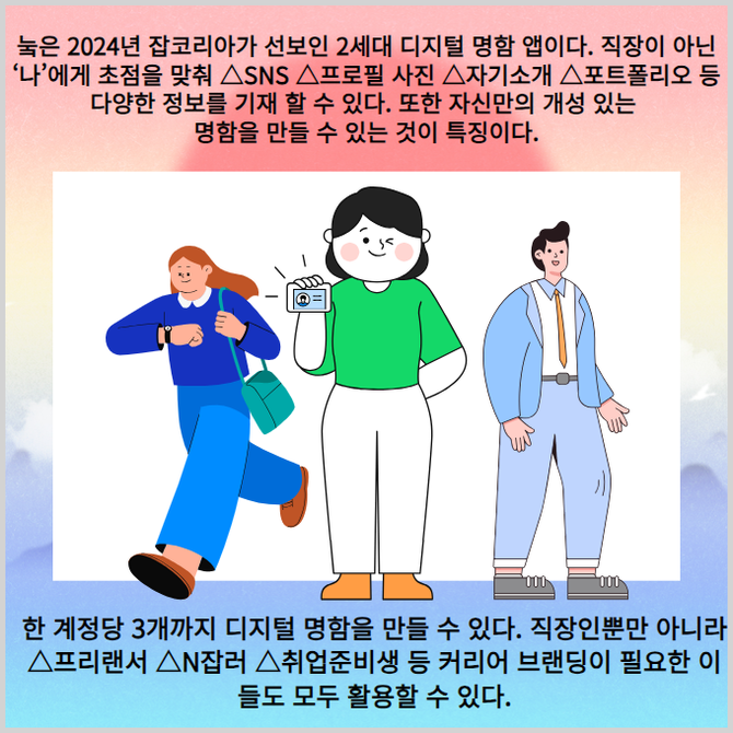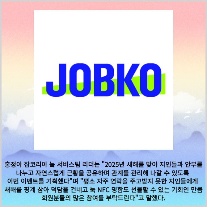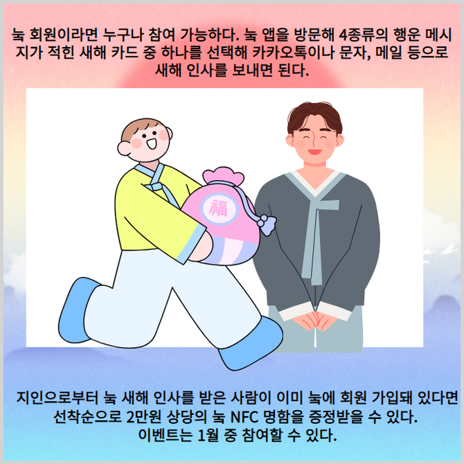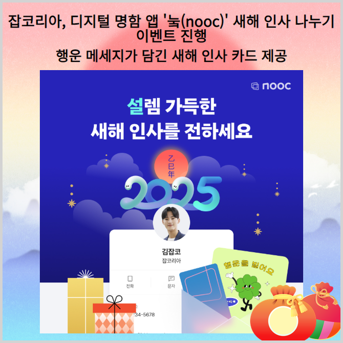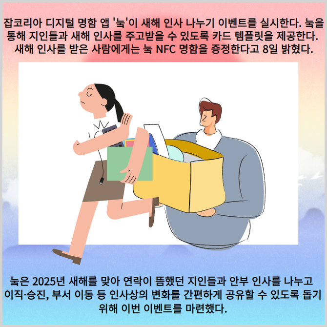 [프라임경제] 잡코리아 디지털 명함 앱 '눜'이 새해 인사 나누기 이벤트를 실시한다. 눜을 통해 지인들과 새해 인사를 주고받을 수 있도록 카드 템플릿을 제공한다. 새해 인사를 받은 사람에게는 눜 NFC 명함을 증정한다고 8일 밝혔다.