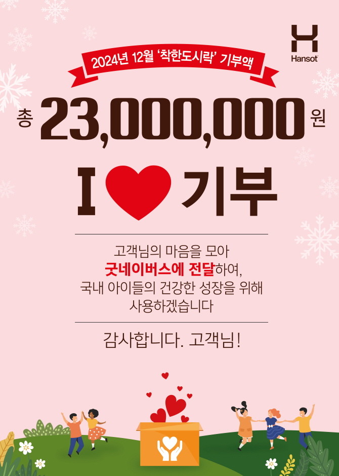한솥도시락은 이번 기부 행사 외에도 아동 복지 향상을 위한 다양한 후원을 실천 중이다. 작년 10월에는 아동복지기관 및 의료기관을 대상으로 1억여원 이상의 후원금을 전달했다. 이어 12월에는 소양무지개동산 아동에게 필요한 물품을 선물하는 특별 후원 행사 ‘산타프로젝트’를 진행한 바 있다.