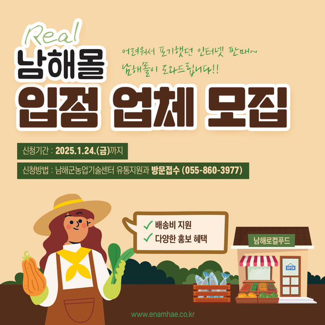 [프라임경제] 남해군이 2025년 남해몰 상반기 입점 신청자를 모집한다. 신청을 희망하는 이는 남해몰 게시판 또는 남해군청 홈페이지(새소식)에서 신청서를 내려받아 작성 후 첨부서류와 함께 남해군 농업기술센터 유통지원과 통합마케팅팀으로 제출하면 된다.