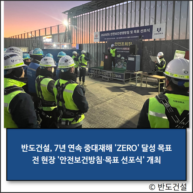 반도건설이 2019년부터 6년 연속 중대재해 발생건수 0건을 기록하고 있는 가운데 올해도 중대재해 7년 연속 'ZERO’ 달성을 위해 협력사들이 참여한 가운데 '전 현장 안전보건방침 및 목표 선포식'을 진행했다.