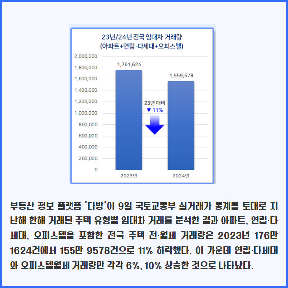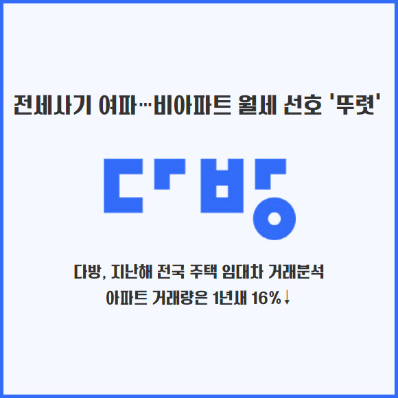 다방, 지난해 전국 주택 임대차 거래분석…아파트 거래량은 1년새 16%↓