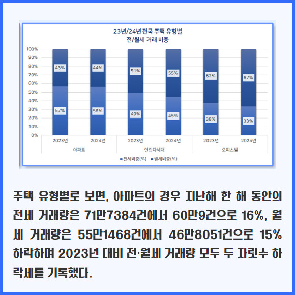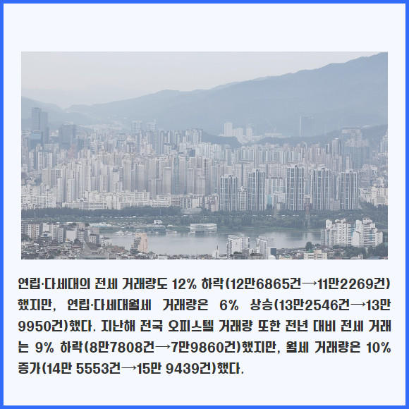 [프라임경제] 지난해 주택 임대차 거래가 전년보다 11% 감소한 가운데 비(非)아파트 시장에서 월세 선호 현상이 뚜렷하게 나타났다.