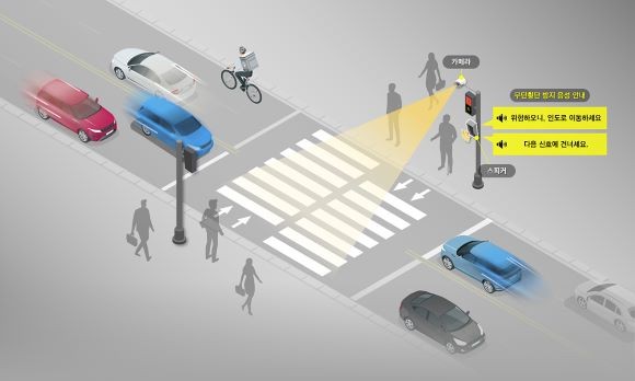 스마트횡단보도는 어린이보호구역 내 횡단보도 양 끝단에 인공지능 기반의 카메라를 설치하고 보행자를 자동 감지해 교통사고 예방을 위한 경고 문구를 음성으로 안내하는 서비스다.