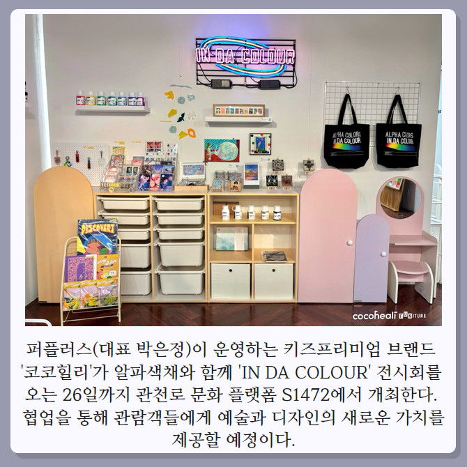 [프라임경제] 퍼플러스(대표 박은정)이 운영하는 키즈프리미엄 브랜드 '코코힐리'가 알파색채와 함께 'IN DA COLOUR' 전시회를 오는 26일까지 관천로 문화 플랫폼 S1472에서 개최한다. 협업을 통해 관람객들에게 예술과 디자인의 새로운 가치를 제공할 예정이다.
