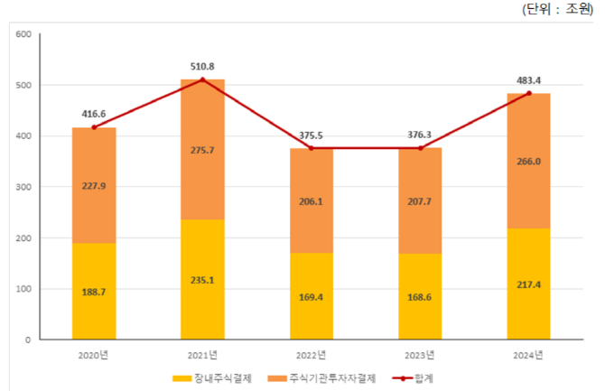 [프라임경제] 한국예탁결제원(이하 예탁원)은 지난해 예탁원을 통한 주식결제대금 총액이 483조4000억원으로 전년(376조3000억원) 대비 28.5% 증가했다고 10일 밝혔다.