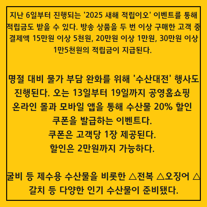 [프라임경제] 공영홈쇼핑이 설 명절을 맞아 중소기업 상품과 농·축·수산물 소비 촉진을 위한 할인 이벤트를 진행한다.