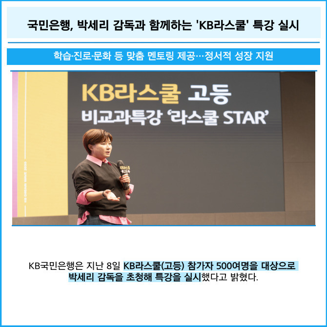 [프라임경제] KB국민은행은 지난 8일 KB라스쿨(고등) 참가자 500여명을 대상으로 박세리 감독을 초청해 특강을 실시했다고 밝혔다.