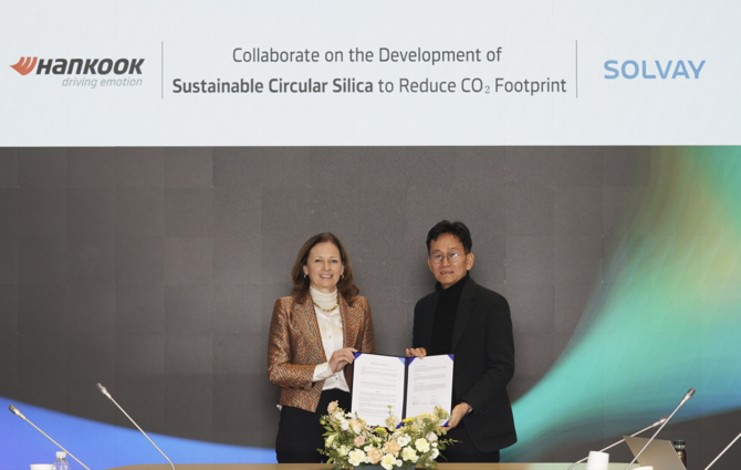 양사는 지난 10일 한국타이어의 하이테크 연구소 한국테크노돔에서 한국타이어 연구개발혁신본부장 구본희 사장과 솔베이 아로마&실리카 글로벌 앤 뉴텐즈(An Nuyttens) 사장 등 주요 관계자들이 참석한 가운데 협약식을 가졌다.