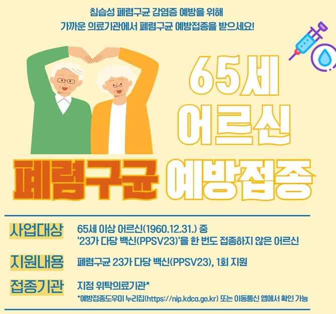 폐렴구균 백신은 65세 이상 연령층에서 평생 1회 접종만으로도 패혈증, 뇌수막염 등과 같은 심각한 합병증을 50~80% 예방할 수 있다.