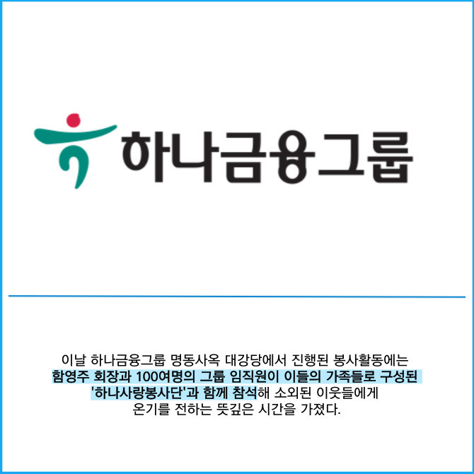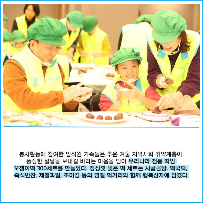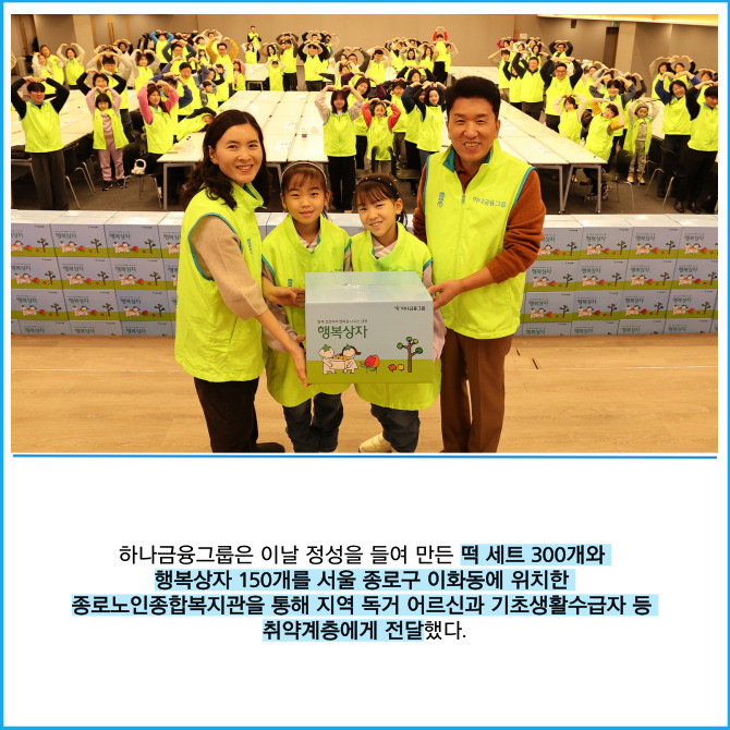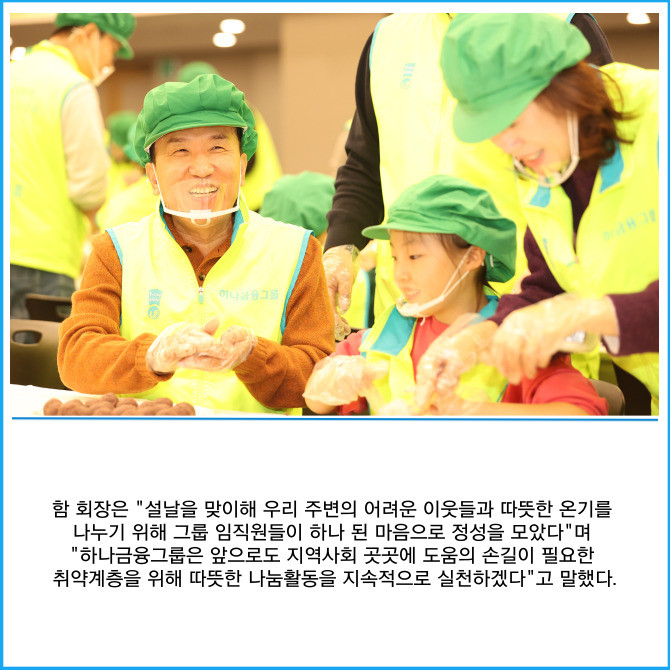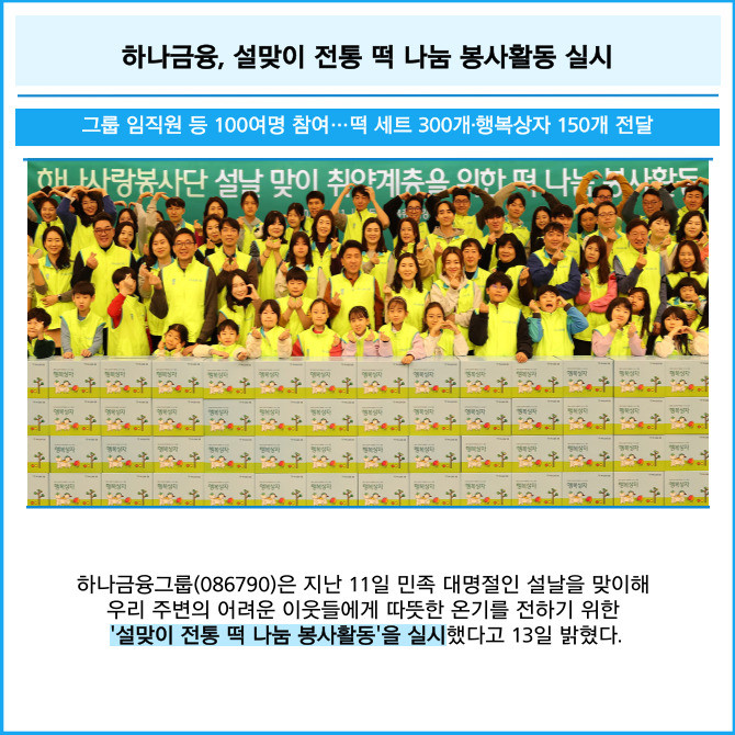 [프라임경제] 하나금융그룹(086790)은 지난 11일 민족 대명절인 설날을 맞이해 우리 주변의 어려운 이웃들에게 따뜻한 온기를 전하기 위한 '설맞이 전통 떡 나눔 봉사활동'을 실시했다고 13일 밝혔다.