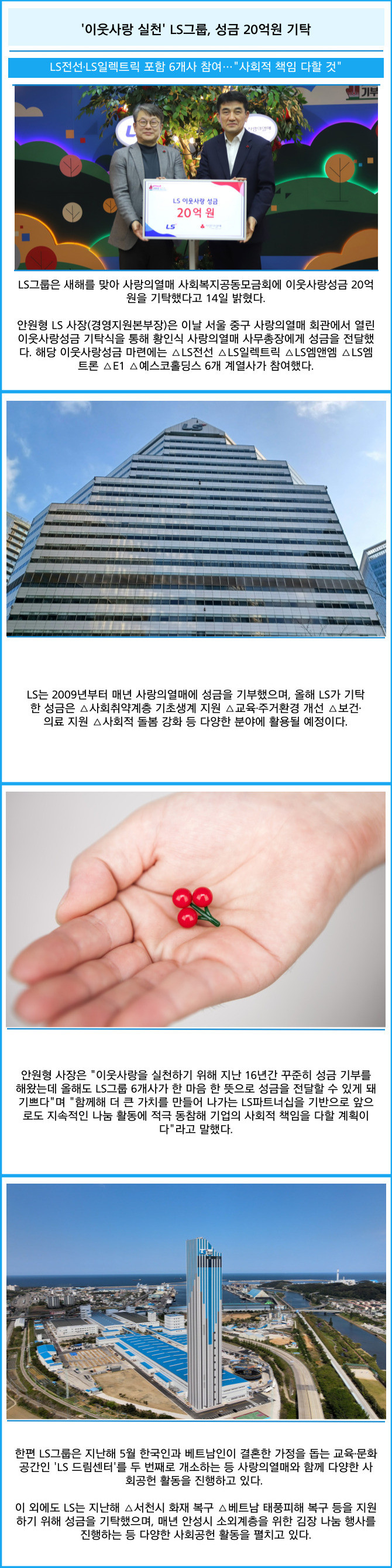 [프라임경제] LS그룹은 새해를 맞아 사랑의열매 사회복지공동모금회에 이웃사랑성금 20억원을 기탁했다고 14일 밝혔다.