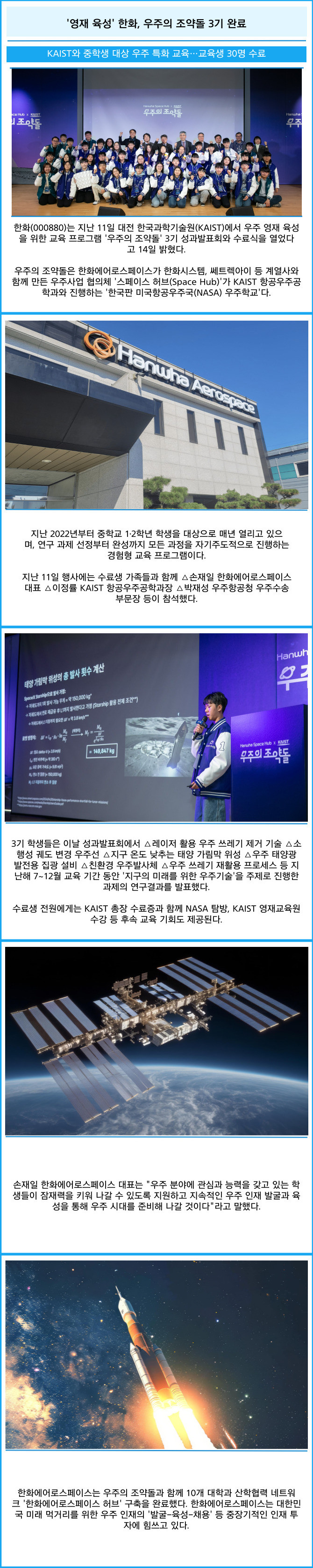 [프라임경제] 한화(000880)는 지난 11일 대전 한국과학기술원(KAIST)에서 우주 영재 육성을 위한 교육 프로그램 '우주의 조약돌' 3기 성과발표회와 수료식을 열었다고 14일 밝혔다.