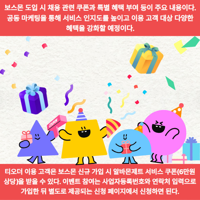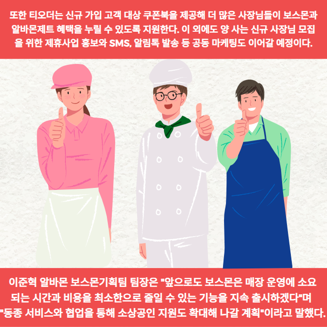 [프라임경제] 알바몬(대표 윤현준)이 운영하는 아르바이트 근태‧급여 관리 서비스 보스몬이 테이블오더 기업 티오더와 소상공인 지원을 위한 제휴 이벤트를 진행한다고 14일 밝혔다.