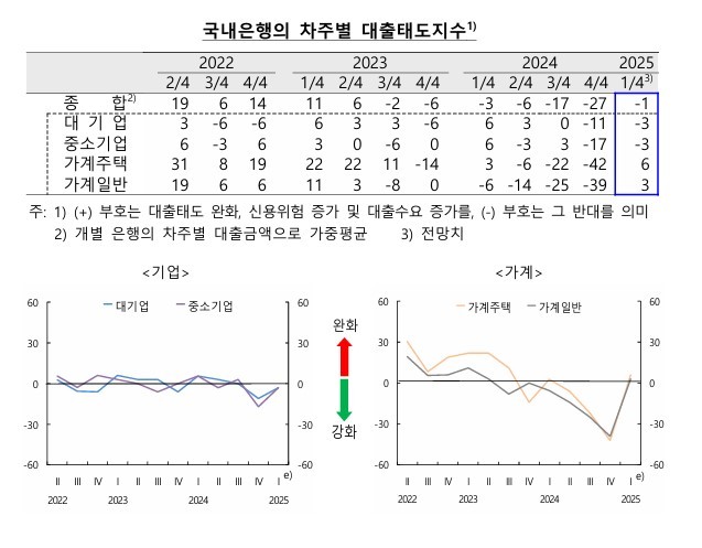 한국은행(이하 한은)이 14일 발표한 '금융기관 대출행태 서베이 결과'에 따르면 1분기 국내은행 대출태도 종합지수는 -1을 기록했다. 이는 지난해 4분기 -27 대비 26p(포인트) 오른 수치다.
