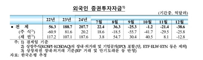 한은 관계자는 "주식자금은 국내 반도체 기업 성장성에 대한 우려가 지속되는 가운데 국내 정치적 불확실성, 글로벌 금리 인하 지연 우려 등으로 순유출을 지속했다"며 "채권자금은 연말을 앞두고 외국인 투자가 둔화된 가운데 국고채 만기상환, 낮은 차익거래유인 지속 등으로 순유출로 전환했다"고 분석했다.
