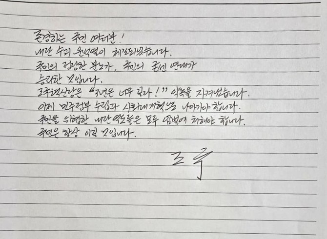 조국 조국혁신당 전 대표는 황현선 혁신당 사무총장의 SNS를 통해 자필 편지를 공개했다. 조국 전 대표는 편지에서 "국민의 정당한 분노가, 국민의 굳센 연대가 승리한 것"이라며 "이제 민주정부 수립과 사회대개혁으로 나아가 국민을 위협한 내란 역도들을 모두 엄벌에 처해야 한다"고 주장했다.