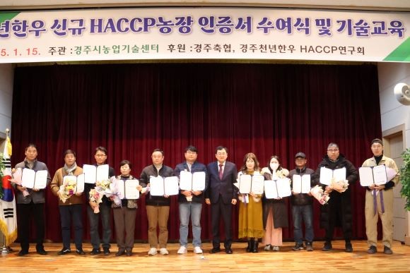 [프라임경제] 경주시가 15일 농업인회관에서 신규 HACCP 인증을 받은 경주천년한우 농장 11곳 대표자들을 초청해 인증서 수여식을 개최했다.
