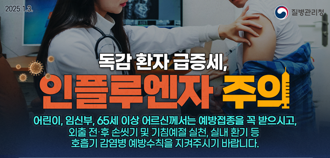 독감 감염은 전국 1월1주차 표본 감시 결과 1000명 당 99.8명으로 지난 2016년 이래 최고 수준으로 발생하고 있어 △65세 이상 △어린이 △면역저하자 등에게 신속한 백신접종이 필요하다.