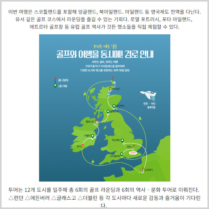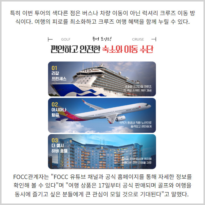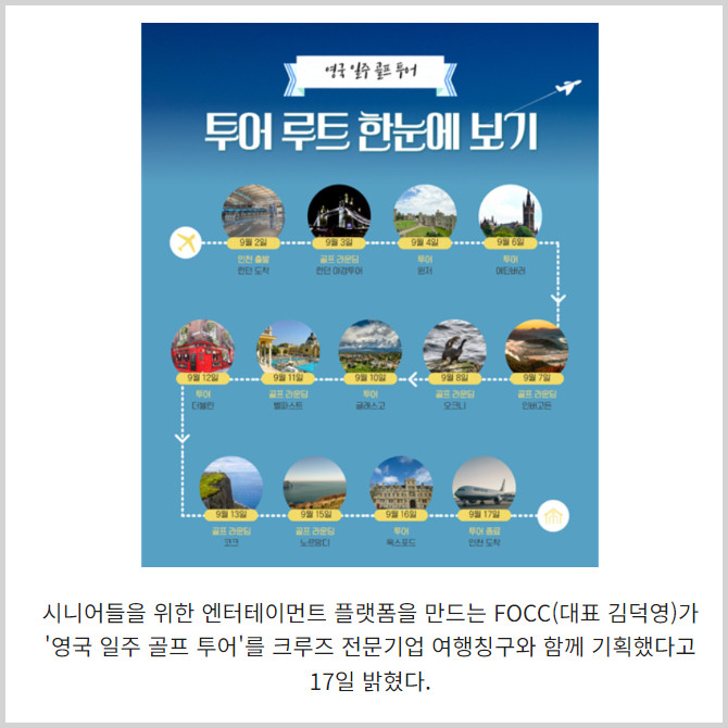 [프라임경제] 시니어들을 위한 엔터테이먼트 플랫폼을 만드는 FOCC(대표 김덕영)가 '영국 일주 골프 투어'를 크루즈 전문기업 여행칭구와 함께 기획했다고 17일 밝혔다.