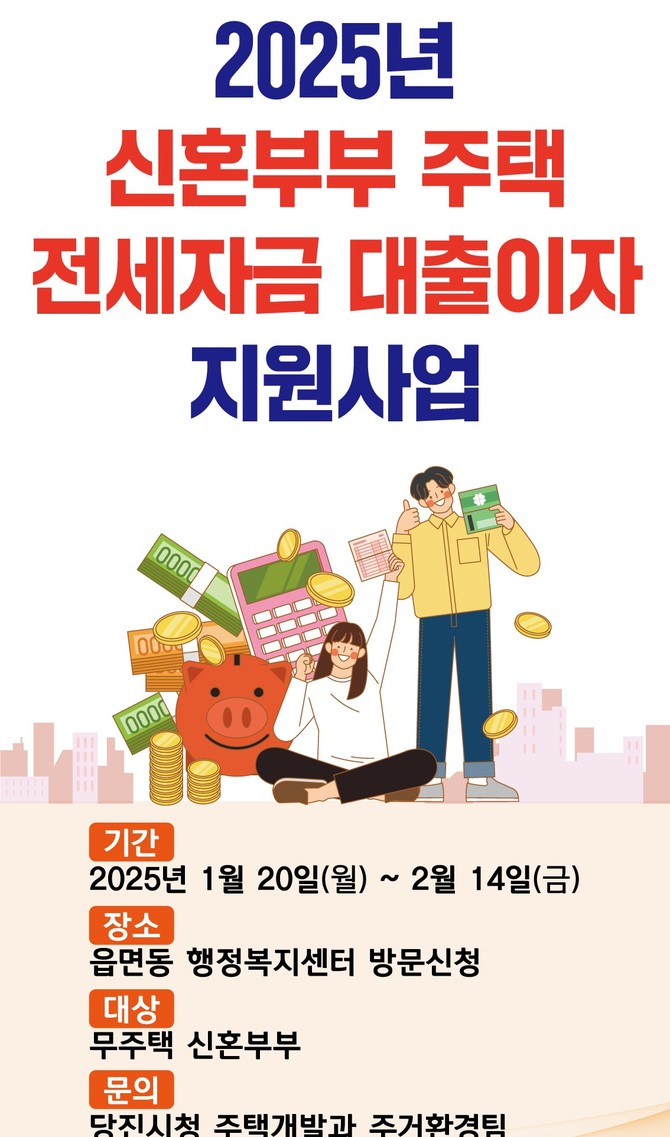 [프라임경제] 충남 당진시는 오는 1월20일부터 2월14일까지 '2025년 신혼부부 주택 전세자금 대출이자 지원사업' 신청자를 모집한다고 17일 밝혔다.