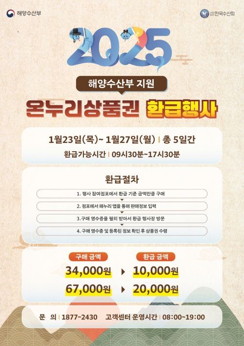 해양수산부에서 주관하는 이 행사는, 오는 23일부터 27일까지 5일간 안동시 전통시장(중앙신시장, 구시장 및 용상시장)에서 진행되며, 수산물을 3만4000원 이상 구입하면 1만원, 6만7000원 이상 구입하면 2만원의 온누리상품권을 환급받을 수 있다.