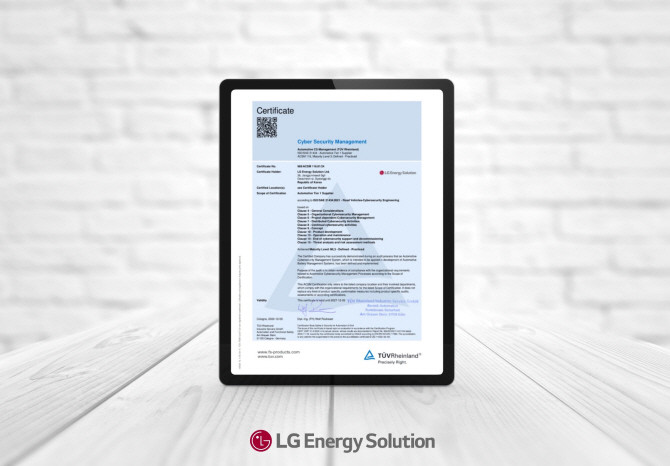 LG에너지솔루션(373220)이 국내 배터리 업계 최초로 사이버 보안 관리체계(CSMS) 레벨3 인증을 획득했다. LG에너지솔루션은 국제 시험 인증기관 TÜV라인란드(티유브이 라인란드)로부터 국제표준 ISO·SAE 21434 기반의 자동차 사이버보안 관리체계(CSMS) 레벨3 인증을 획득했다고 20일 밝혔다.