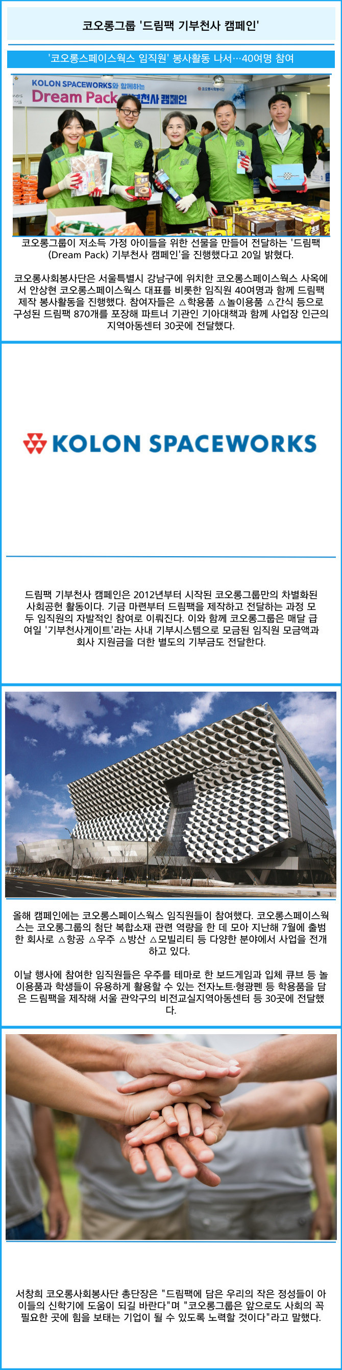 [프라임경제] 코오롱그룹이 저소득 가정 아이들을 위한 선물을 만들어 전달하는 '드림팩(Dream Pack) 기부천사 캠페인'을 진행했다고 20일 밝혔다.