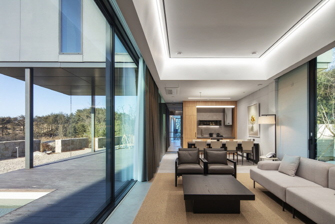모듈러 건축 기술 특징을 인지하지 못할 만큼 편안하고 풍부한 실내 공간을 제공하고, 전통 건축과 다를 바 없는 공간감과 안락함을 느낄 수 있다. 아울러 온전히 자연 속에 머무르는 경험을 제공하기 위해 내부공간과 연계되는 데크, 자연을 담은 소박한 정원, 대지를 둘러싼 풍부한 수목까지 섬세하게 디자인했다.