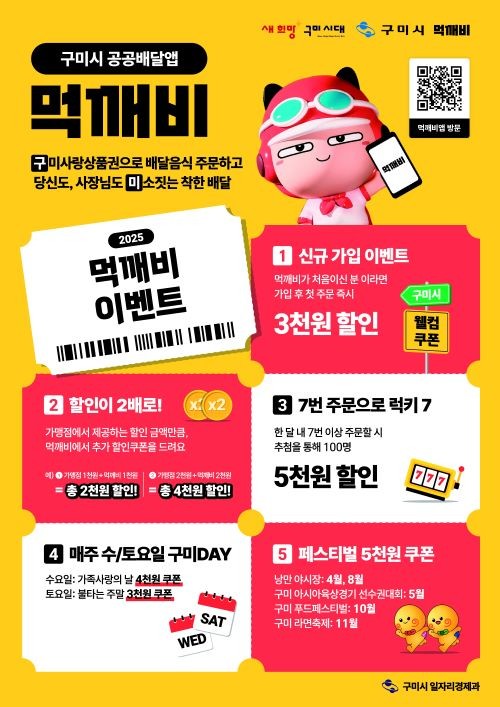 이번 이벤트는 △신규 가입자 대상 3000원 할인 △매주 수·토요일 4000원·3000원 할인 △최대 4000원까지 적용되는 더블할인 △7번 주문으로 럭키 7 이벤트 등 정기 할인으로 구성됐다. 또, △2025 아시아육상선수권대회 등 구미시 주요 축제와 연계한 비정기 할인 이벤트로 5000원 할인 쿠폰이 지급된다.