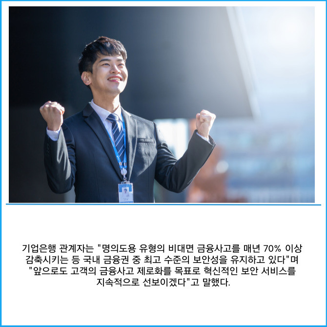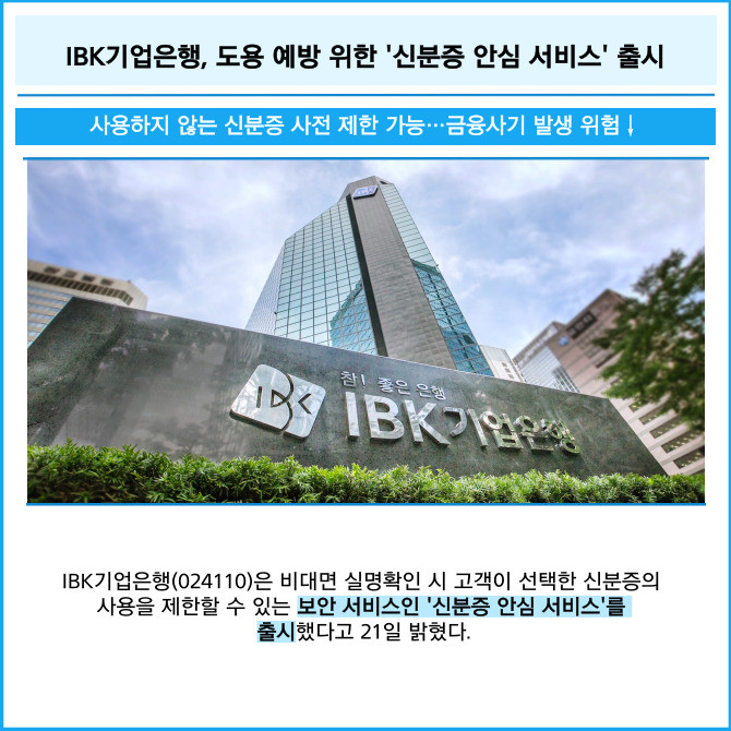 [프라임경제] IBK기업은행(024110)은 비대면 실명확인 시 고객이 선택한 신분증의 사용을 제한할 수 있는 보안 서비스인 '신분증 안심 서비스'를 출시했다고 21일 밝혔다.