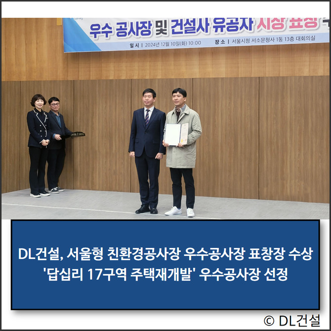 DL건설(001880)의 '답십리 17구역 주택재개발' 현장이 '서울형 친환경공사장 이행평가'에서 우수공사장에 선정돼 표창장을 수여했다.