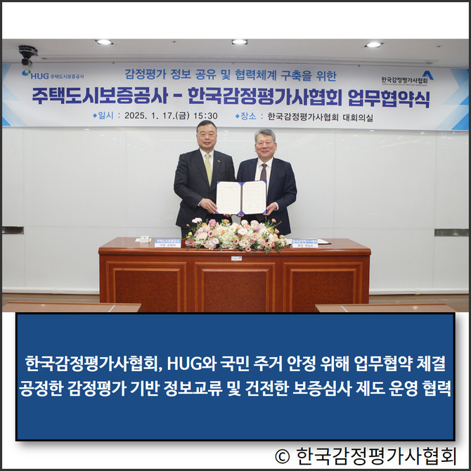 한국감정평가사협회(이하 협회)와 주택도시보증공사(이하 HUG)가 감정평가사회관(서울시 서초구 방배동 소재)에서 국민 주거 안정을 위한 업무협약을 체결했다.