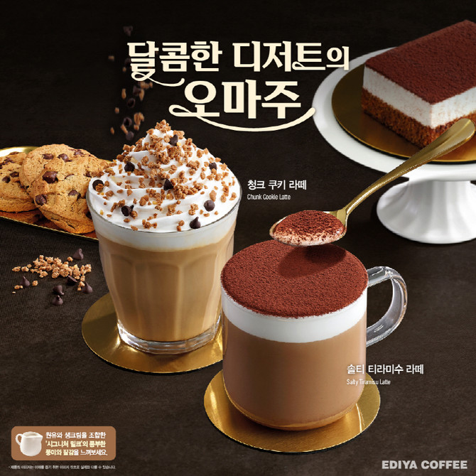 이번 신제품 2종은 △솔티 티라미수 라떼 △청크 쿠키 라떼로 구성됐다. '솔티 티라미수 라떼'는 이디야커피의 인기 디저트 '초코 티라미수 케이크'를 음료로 재해석해 부드러운 크림치즈와 진한 코코아의 풍미를 살렸다. '청크 쿠키 라떼'는 '초코렛 청크 쿠키'의 고소하고 달콤한 맛을 담았으며 바삭한 토핑으로 식감을 더했다.