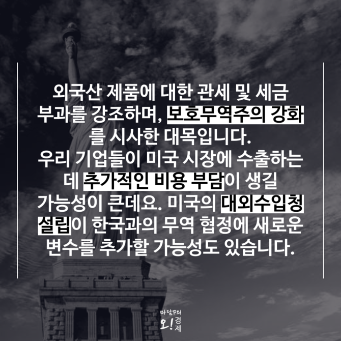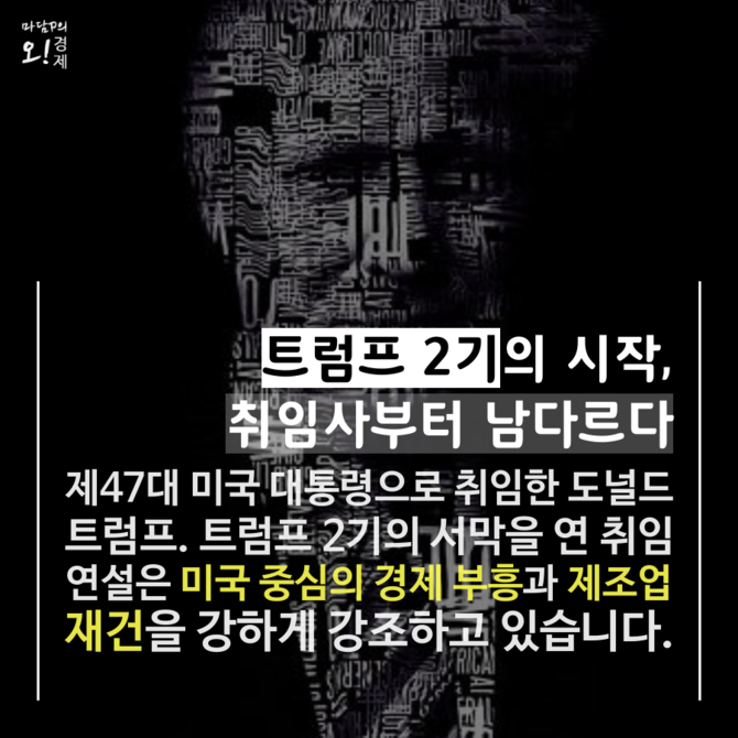 [프라임경제] 도널드 트럼프 제47대 미국 대통령의 취임 연설은 미국 중심의 경제 부흥과 제조업 재건을 강하게 강조했다. 그 속에서 보호무역주의 강화, 에너지 정책 변화, 자동차 산업 부흥 등 다양한 정책 방향이 제시되었는데 이는 한국 경제에 상당한 영향을 미칠 것으로 보인다.