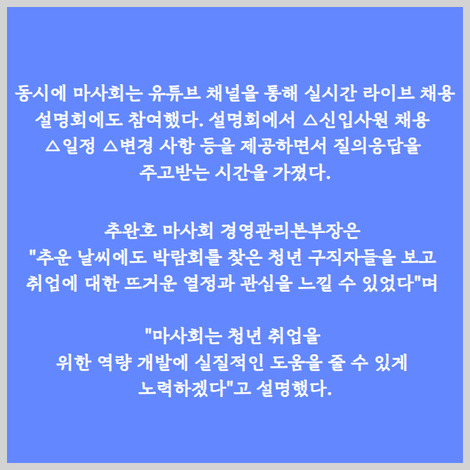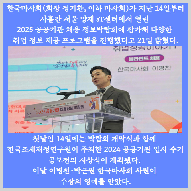 [프라임경제] 한국마사회(회장 정기환, 이하 마사회)가 지난 14일부터 사흘간 서울 양재 aT센터에서 열린 2025 공공기관 채용 정보박람회에 참가해 다양한 취업 정보 제공 프로그램을 진행했다고 21일 밝혔다.