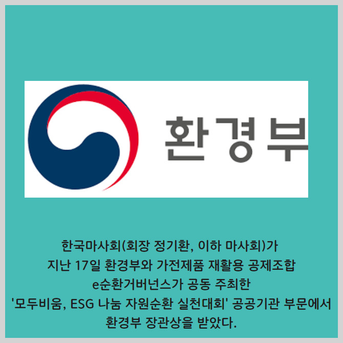 [프라임경제] 한국마사회(회장 정기환, 이하 마사회)가 지난 17일 환경부와 가전제품 재활용 공제조합 e순환거버넌스가 공동 주최한 '모두비움, ESG 나눔 자원순환 실천대회' 공공기관 부문에서 환경부 장관상을 받았다.